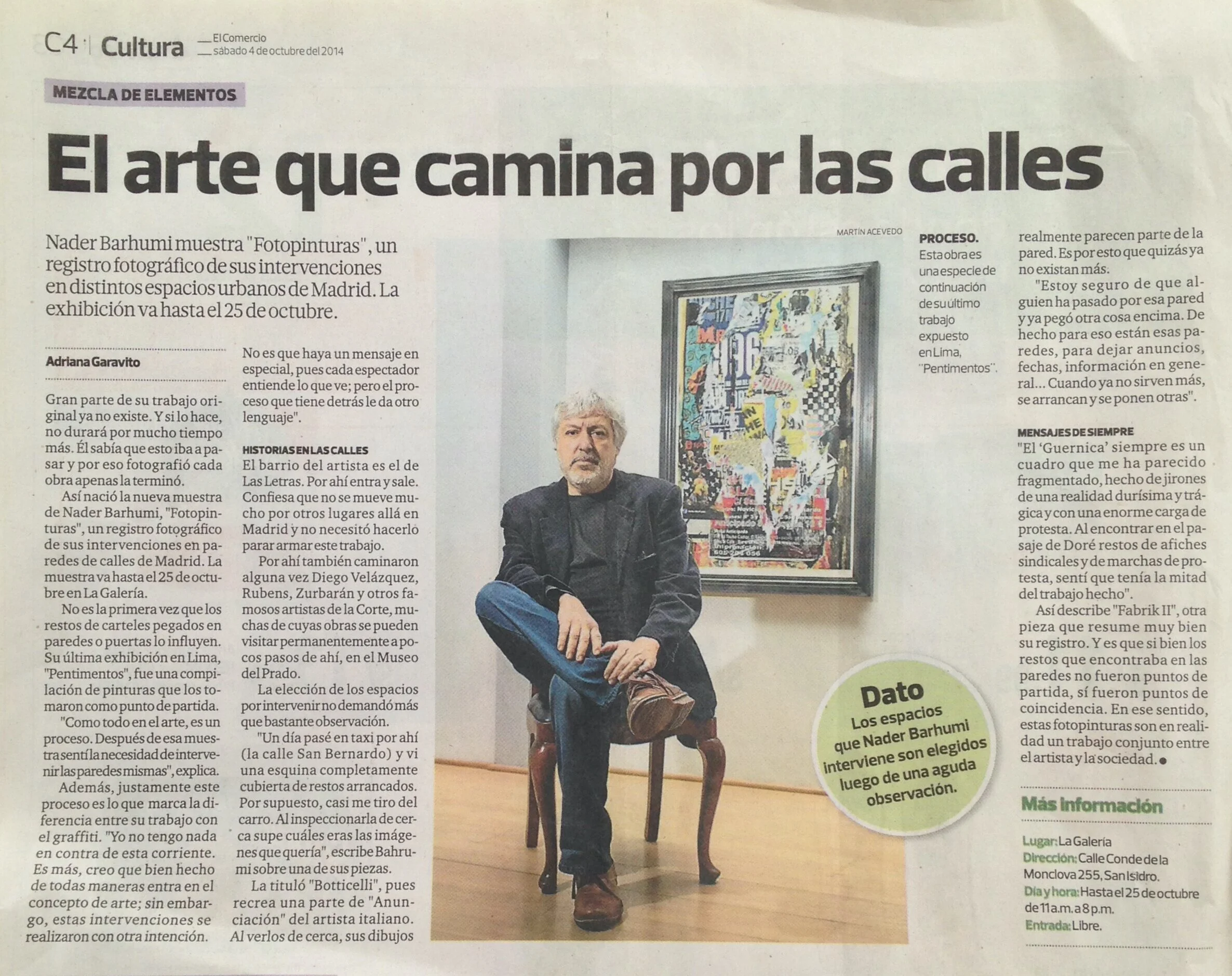 “El artista peruano Nader Barhumi es un enamorado de Madrid y del barrio de las Letras y sin duda, sus obras translucen esa pasión por nuestra ciudad. Unas obras en diferentes formatos y distintas técnicas, desde el collage al metacrilato en las que aborda diferentes paisajes de la ciudad: la estatua del Ángel Caído, la Cibeles, las Tres Gracias que se pueden admirar en el Museo del Prado...”
