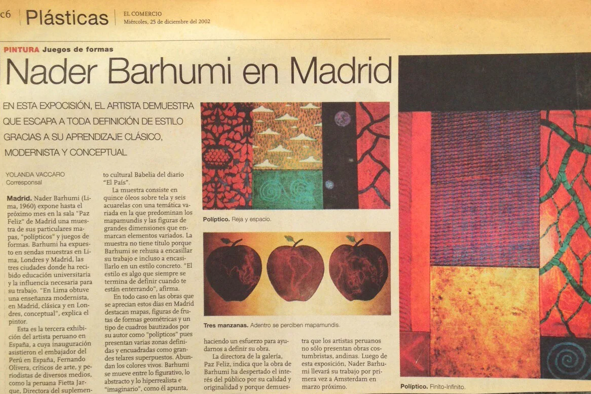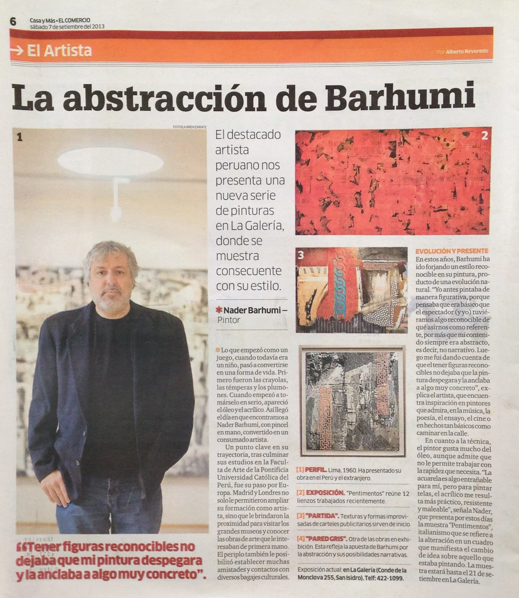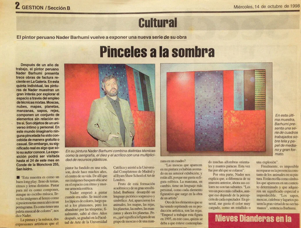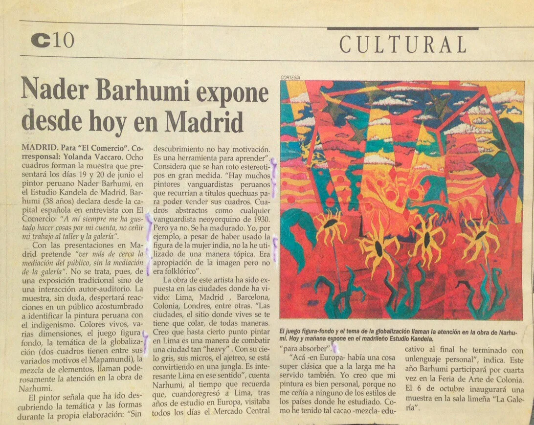 “After four years in Madrid, Nader Barhumi returns to Peru and brings together 10 paintings with no apparent features in common, except for his strong experimental imprint.”